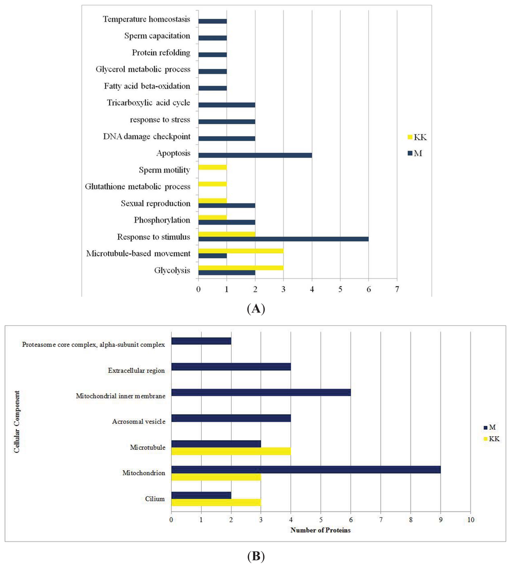 As a result of Gene Ontology (GO) analysis, regulated proteins from Kedah Kelantan (KK) and Mafriwal (M) sperm were classified based on their role in biological processes (A) and their location in the cell (B).