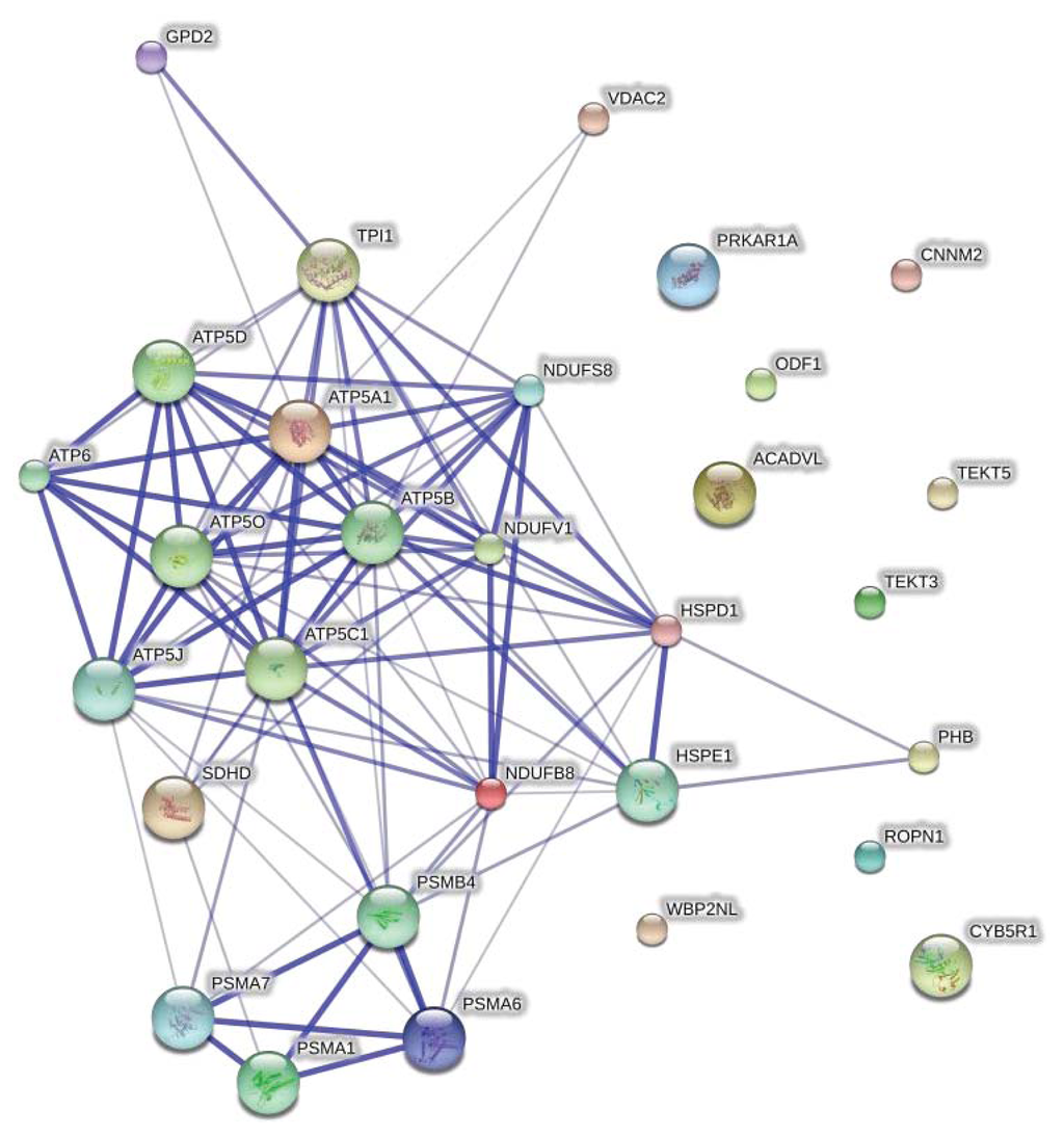 Succinate dehydrogenase flavoprotein subunit (FP) and 60 KDa heat shock protein were found to be M specific. Heat shock proteins (HSPs) are molecular chaperons as well as being stress induced expressed proteins in different cells []. HSP-60 is localized in the mid-piece of ejaculated human sperm []. It has been shown that the regulation of different HSPs in human sperm is associated with fertility impairment [,]. It has been hypothesized that this protein plays a role in sperm-zona pellucida interaction [].
