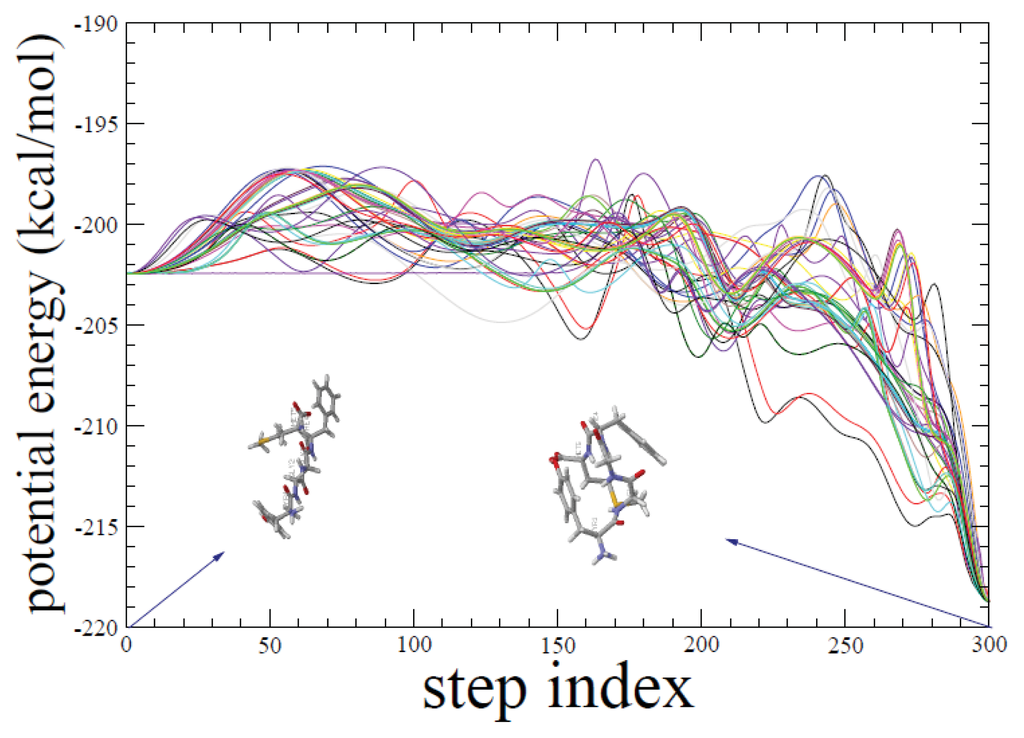 Fifty independent potential-energy variations for met-enkephalin are shown along the action-derived molecular dynamics (ADMD) step index. The same initial and final conformations are used for all ADMD simulations. The potential-energy variations clearly show the existence of multiple pathways. There exist many alternative folding routes that connect the extended and compact peptide conformations. Two conformations used as inputs for ADMD simulations are shown. The initial (final) conformation shown at j = 0 (300) is prepared by applying local energy minimization to the fully-extended (compact) structure. We observe that one of the ADMD trajectories is of almost constant potential energy in the first half of the trajectory. In this part, the kinetic energy is rather high. It should be noted that the total energy (sum of kinetic energy and potential energy) is conserved along all ADMD pathways.