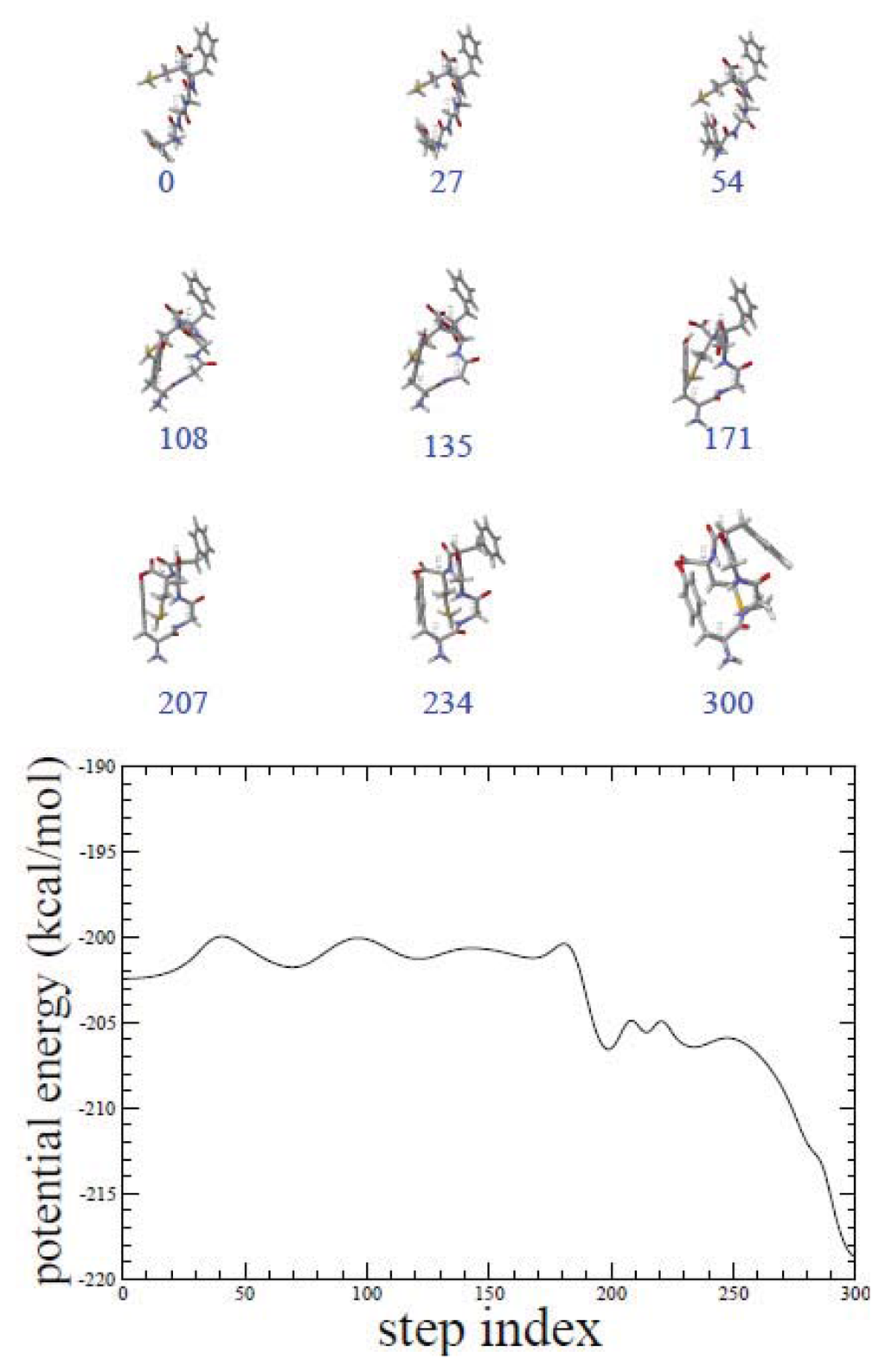 Snapshots of the lowest potential-energy-barrier pathway for met-enkephalin are shown. Potential-energy fluctuation is shown along the ADMD step index. As the index increases, the potential-energies related to the pathway model undergo fluctuation. Potential-energy fluctuations associated with the most-fit (lowest potential-energy barrier profile) pathway from the simulations are shown.