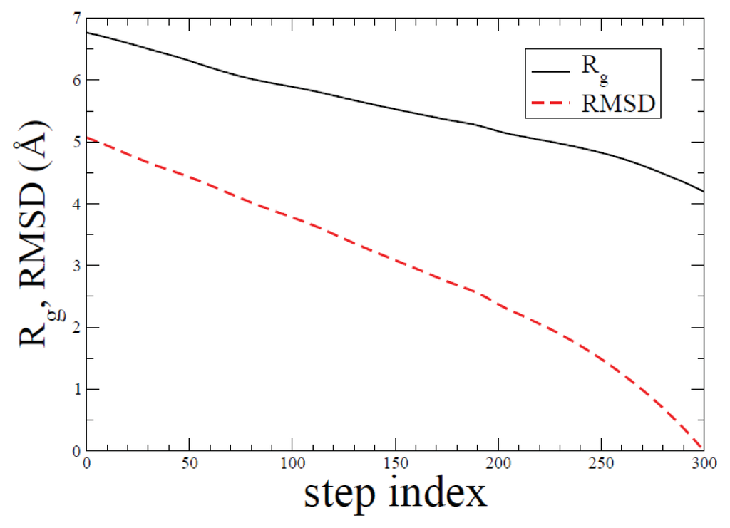 A set of characteristic quantities along the folding pathway is shown in Figure 3. Radius of gyration (Rg) and root-mean square deviation from the compact folded conformation are shown. For RMSD calculations, we used all atoms. We have used the quaternion method [,] to superimpose two given structures.