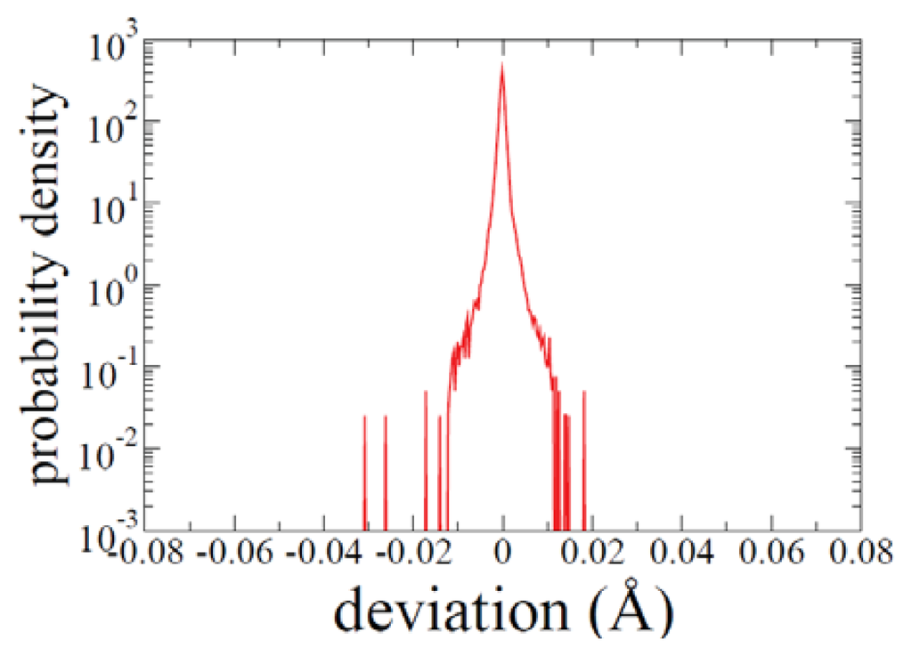 A typical distribution of the scalar “error variables” introduced in the previous section is shown in Figure 4. An example for measuring the path quality of a transition path connecting two given configurations is shown. Here, for the pathway generation, Δ = 8.063 fs, N = 75 atoms, and P = 300 are used. Therefore, a total of 3N(P − 1) = 67275 scalar “error variables” are used to obtain the distribution function.