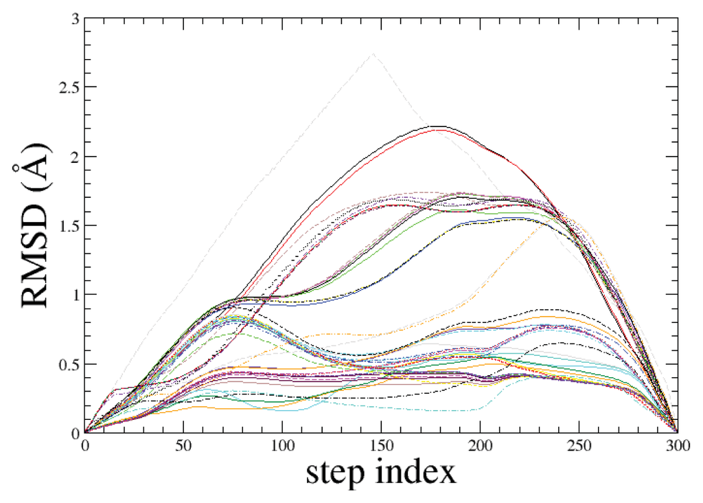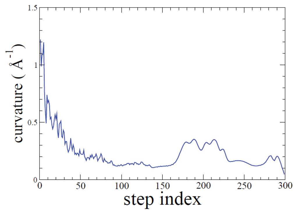 Generated ADMD pathways are smooth. That is, no abrupt changes of the conformation are observed. To demonstrate this, we have calculated the curvature of the transition pathway along the ADMD step index (Figure 5). The curvature is defined as follows.