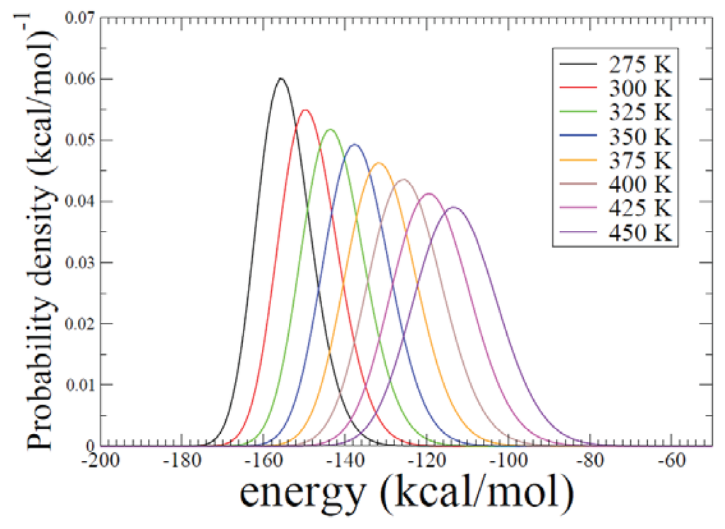 By using REMD simulations we have obtained probability density functions (PDFs) for a set of temperatures as shown in Figure 6. In the figure, we observe a significant amount of energy overlaps in the coverage of PDF between two adjacent temperatures Ti and Ti + 1.