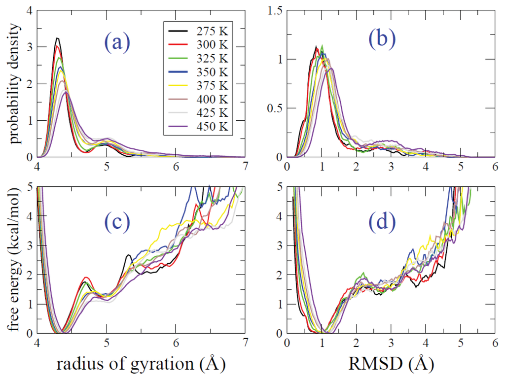 Radius of gyration distribution as a function of temperature obtained from REMD simulation is shown in Figure 7a. The average of radius of gyration increases as temperature increases. Similarly, RMSD distribution as a function of temperature obtained from REMD simulation is also shown in Figure 7b. Again, we find that the average RMSD increases as temperature increases, indicating that the population of the extended-like structures increases. Free energy against the radius of gyration and RMSD are shown in Figure 7c,d, respectively.