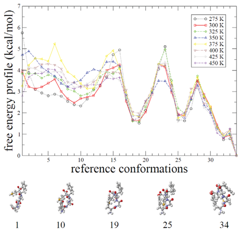 In Figure 8, a free-energy profile projected on the 34 reference conformations is shown. A set of free-energy valleys (reference indices, 1, 10, 19, 25 and 34) can be defined along the profile. These valleys represent peptide conformations with accumulated population during the REMD simulations. These (extended, intermediate, and compact) structures are shown along the free-energy profile over the reaction coordinate. Here, the peptide encounters various quasi-stable intermediate states between extended and compact structures. Non-synchronization between gain in potential energy and loss in conformational entropy results in a multi-basin free energy profile. We demonstrate that the alliance between the two simulation methods, ADMD and REMD, has a great synergistic effect in understanding the protein folding process.
