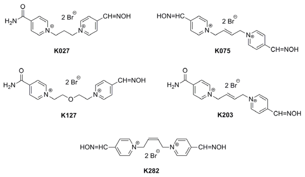 - Kassa, J.; Karasova, J.Z.; Tesarova, S.; Kuca, K.; Musilek, K. A comparison of the ability of newly-developed bispyridinium oxime K203 and currently available oximes (trimedoxime, obidoxime, HI-6) to counteract the acute neurotoxicity of soman in rats. Toxicol. Mech. Methods 2010, 20, 445–451. [Google Scholar]