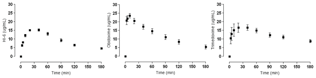 All compounds and standards selected for testing are structurally similar, and during in vitro screening tests also had high reactivation potency. Based on these preliminary experiments further testing to obtain pharmacokinetic data was performed. We used in vivo experiments to acquire relevant kinetic data for these compounds. From Figure 3 it is clear that HI-6 and trimedoxime have an ideal pharmacokinetic profile. However, Cmax is reached only after a relatively long time, which could be a disadvantage when rapid reactivation is needed especially against quickly aging AChE inhibitors (e.g., soman). Nevertheless, HI-6 is the only available oxime so far to show some efficacy against soman intoxication []. The Cmax time delay seems to be of importance, since obidoxime reaches Cmax swiftly when compared to the other compounds and has relatively rapid elimination from the plasma. But at the same time obidoxime has demonstrated significant potency against a great number of AChE inhibitors and is part of the military standard antidote kits. Indeed, Cmax values alone cannot be correlated with the therapeutic efficacy of these compounds. Since these compounds serve as antidotes against nerve agents, a clinical trial determining minimum plasma concentrations needed for effective therapy is not feasible. For these reasons, characteristics of these compounds are based predominantly on pre-clinical experimental data.