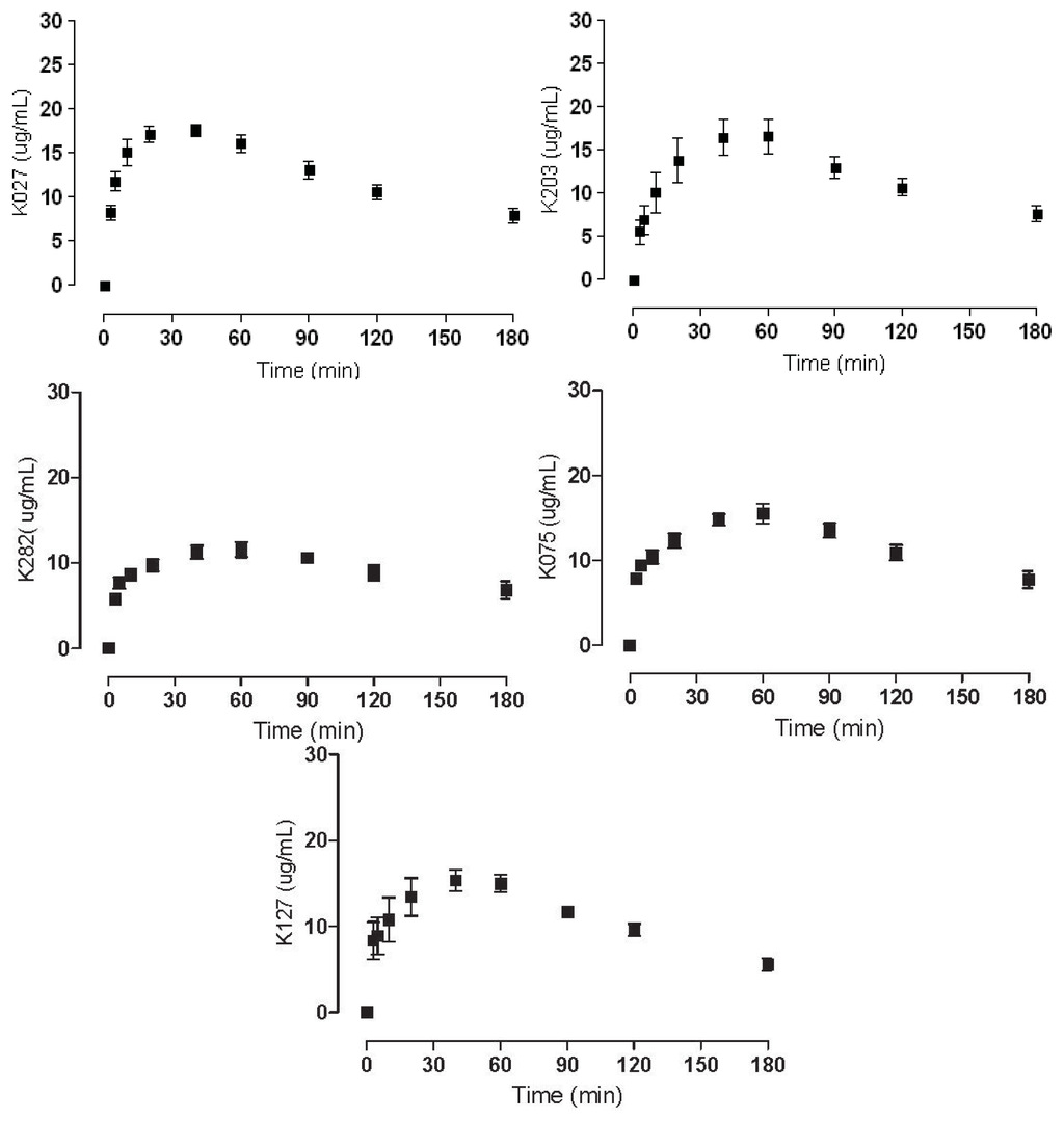 As is evident from Table 3, the binding to HSA by the studied compounds is insignificant for potential clinical use, not even exceeding 20%. Nonetheless, correlations between binding, structure and pharmacokinetic curves can be drawn. The compounds K075, K203, and K282 have the highest binding potency (Table 3). Furthermore, all three compounds have linking chains between the two pyridine rings of the same length (4C) with a double bond between 2C and 3C. None of the other compounds have similar links (i.e., they either contain an oxygen atom, only 3C, or no double bond). Moreover, the pharmacokinetic curves for compounds K075, K203, and K282 highly resemble each other (Figure 4), with profiles reflecting the possibility that the rise of plasma concentrations is much slower as HSA binds a higher percentage of these compounds, and their Cmax resemble a plateau because HSA is liberating the bound compound. Though these results from the kinetic data are intriguing, crystallographic tests would have to be performed to confirm this hypothesis.