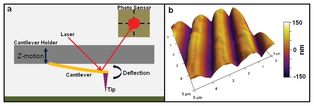 AFM measurement relies on the motions of a sharp tip positioned at the end of a flexible cantilever, which interacts with the sample via surface forces such as Van der Waals forces, electrostatic forces and capillary forces [5,11]. The cantilever behaves like a spring, so that any forces acting on the AFM tip cause the cantilever to deflect. These interactions are detected by the positioning of a laser reflected off of the back of the cantilever onto a 4-quadrant photo sensor.