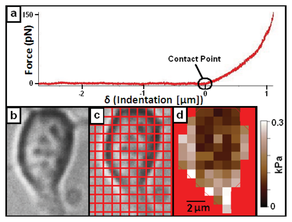 (a) Typical AFM force vs. indentation curve. The contact point is defined as the point at which the force vs. indentation slope begins to increase above noise level. The flat line indicates the approach portion, where the cantilever is moving down but it is not yet in contact with the surface. The curved portion after the contact point indicates how the total force of the tip on the sample changes as the cantilever indents the surface; (b) Optical image of living cortical neuron; (c) Neuron shown in (a) with superimposed 1 × 1 micron grid; (d) Elastic modulus map of neuron from (c), where force vs. indentation curves are taken at each point on the grid and elastic modulus values are calculated from the indentation curves (see text). These images illustrate the elasticity mapping procedure where optical and AFM measurements are taken simultaneously. Images taken by Elise Spedden, in Staii lab at Tufts University.