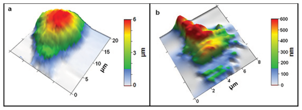 (a) Example of a 3D AFM topography image of a live cortical neuron soma; (b) 3D AFM topography image of a live neuron growth cone. Both images were taken in force-volume mode, thus rendering lower spatial resolution than high-resolution AFM topography in tapping mode. However, force-volume mode images contain both topographical and elasticity information as explained in the main text. Images taken by Elise Spedden in Staii lab at Tufts University.