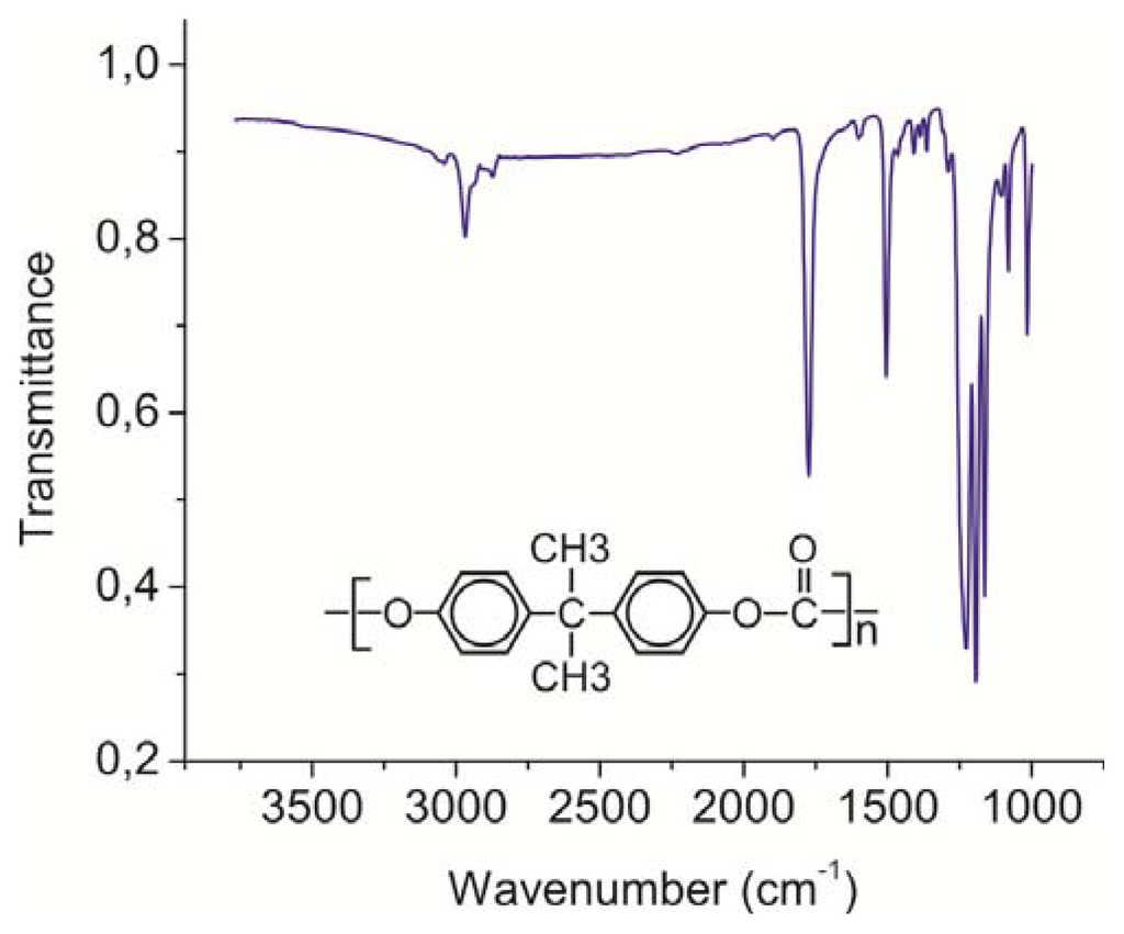 The principal peaks in the PC film IR spectrum shown in Figure 1. They should be caused by the following vibrations: C–H aromatic ring deformations around 3000 cm−1; C=O carbonate group deformations near 1775 cm−1; C=C-vibrations at 1506 cm−1; asymmetric O–C–O carbonate group deformations in the range 1232–1164 cm−1; CH3-vibrations at 1081 cm−1; symmetric O–C–O carbonate group deformations near 1015 cm−1 [12].