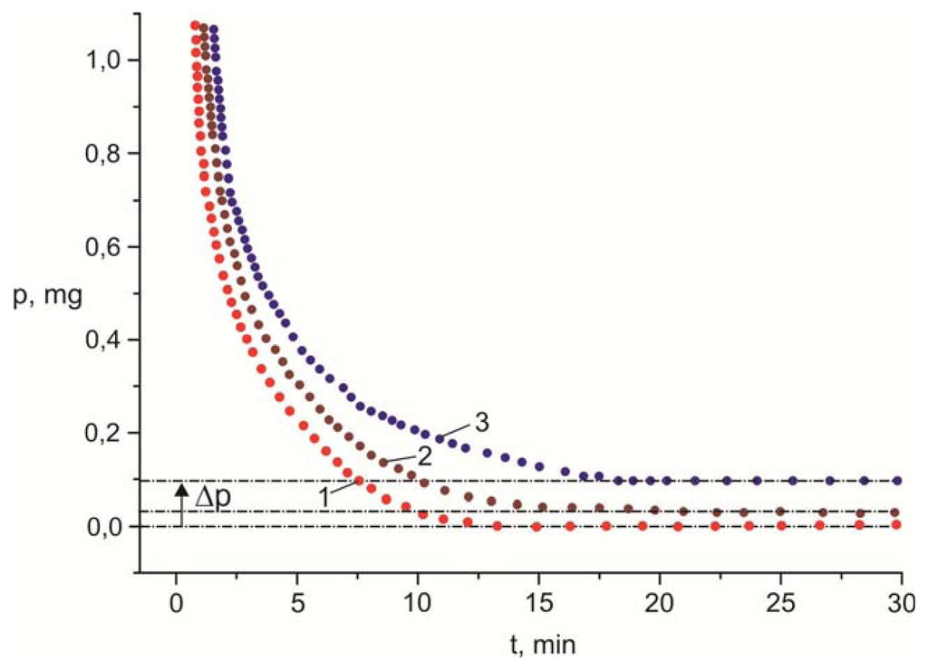 Figure 10 presents the dependences p (t) for the PC film with the weight p = 15 mg deposited by centrifugation onto the glass surface and dried at the temperatures T = 120, 50, and 24 °C (curves 1, 2 and 3). For the horizontal portion of curve 1, the value p = 0 was taken, since the dependences p(t) obtained at higher temperatures, up to the glass-transition point T = 141 °C, did not differ from this curve within the weight measurement accuracy Δp = ±10 μg. It can be seen that the straight lines p = const corresponding to the horizontal portions of the curves p(t) at T = 50 and 24 °C differ from the curve p(t) = 0 at T = 120 °C by the values Δp = 30 and 90 μg. The values of Δp correspond to the amount of the residual solvent in the polymer film after its drying at a chosen temperature.