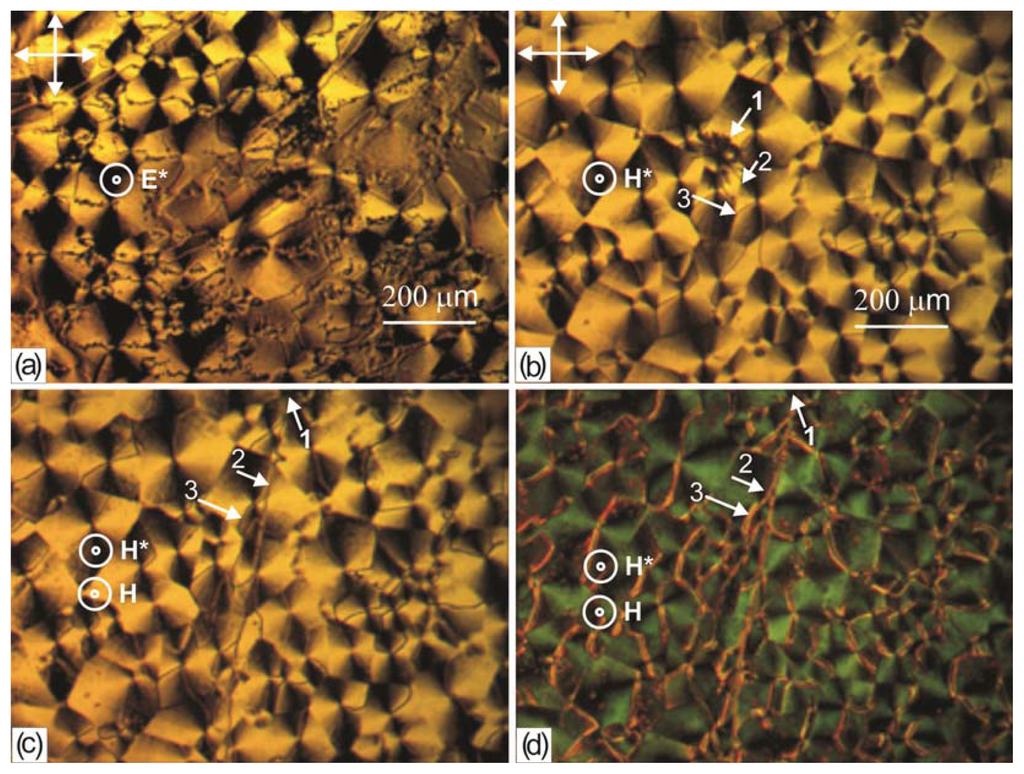 If during the growth of the nematic domains on the PC surface the LC cell was subjected to mechanical, electrical, or magnetic factors, the disclination lines can appear not localized at the surface. Figure 12 shows a microphotograph of the domain ensemble grown in the electric field (a) or magnetic field (b–d) H* = 25 kOe directed perpendicular to the polymer film. It can be seen that the disclination lines formed a multibranch network, passing through the domain centers. In addition, one can see a ball-shaped defect with the outgoing disclination lines (1) occasionally occurred during the growth. The defect is free, since in the magnetic field H = 1 kOe (Figure 12c) it shifted to the image edge. However, the disclination lines appeared in the form of the main line (2) with the outgoing side lines (3) that end at the domain centers. Upon deformation of the volume LC layer by the stronger magnetic field H = 4 kOe, the multibranch thread network becomes pronounced (Figure 12d).