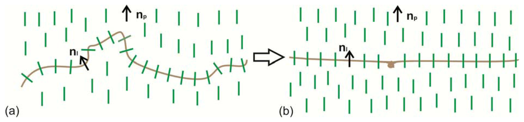 Schematic in plane of the transition of a part of the PC polymer chain with absorbed LC molecules (L) from the distorted state (a) to the energetically more favorable strengthened state (b); nl is the unit vector corresponding to the averaged alignment of absorbed LC molecules along the polymer chain and np is the director of the planar volume LC layer.
