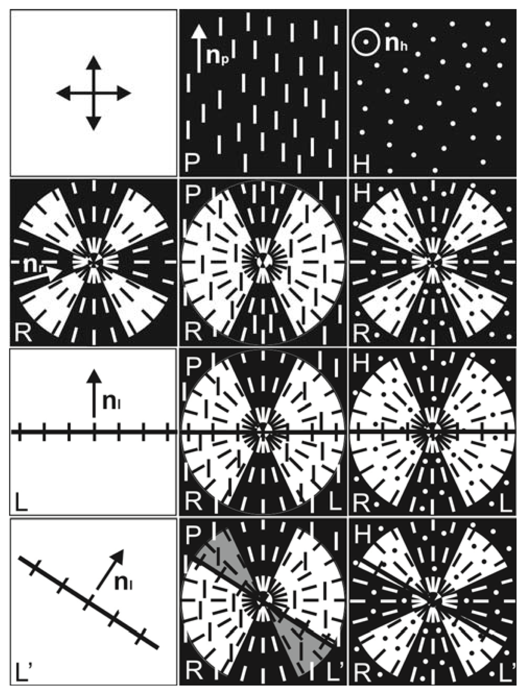 Orientational structures at different configurations of the LC director on the PC surface and in the top volume nematic layer: P and H are the planar and homeotropic LC orientations in the volume layer, R is the radial LC configuration on the PC surface, and L and L′ are the structural elements in the form of polymer chains visualized by LC molecules and located along the direction of one of the polarizers or at an angle of about 45° to it. Combinations of PR, HR, PRL, HRL, PRL′, HRL′, the corresponding domain structures are represented as elements of a matrix with columns containing the orientations P, H and rows that contain the configurations R, L, L′.
