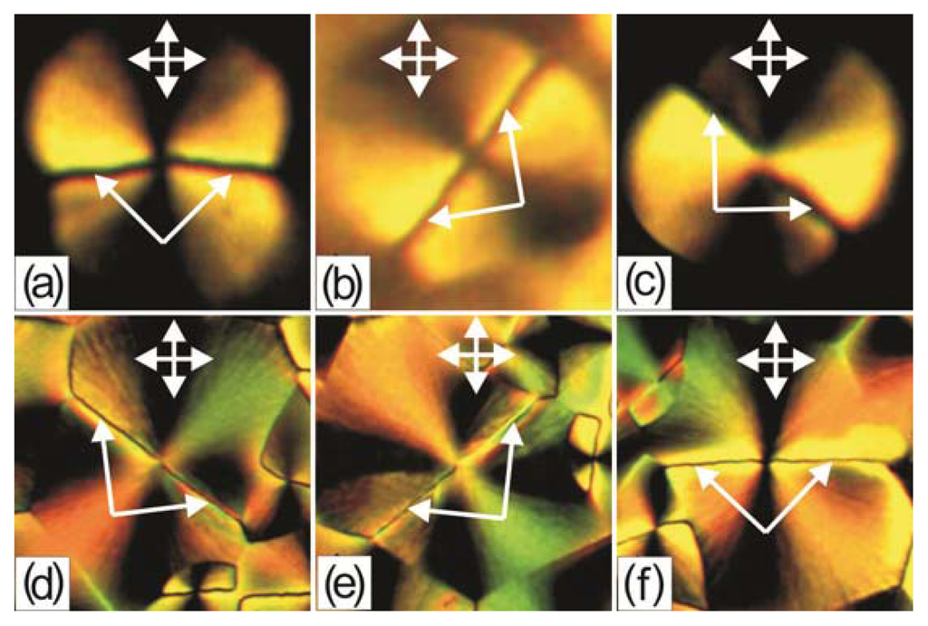 Figure 3 presents microphotographs of two individual b- and c-domains in crossed polarizers. It can be seen that the b-domain is a disk with two extinction bands when the disclination lines are beyond them (Figure 3a). When the sample is rotated, the forms of the domain and the disclination lines do not change but the background above the domain brightens (Figure 3b). If the disclination lines in the domain appear near the dark and bright domain region boundaries, then one can observe the brightened sectors (Figure 3c). The c-domain is cross-shaped with four extinction bands when the disclination lines are beyond them (Figure 3d). When the sample is rotated by an angle close to 45°, the forms of the domain and disclination lines do not change and the extinction bands stay at their position (Figure 3e). However, if the disclination lines appear close to one of the light polarization directions, the corresponding extinction bands brighten (Figure 3f).