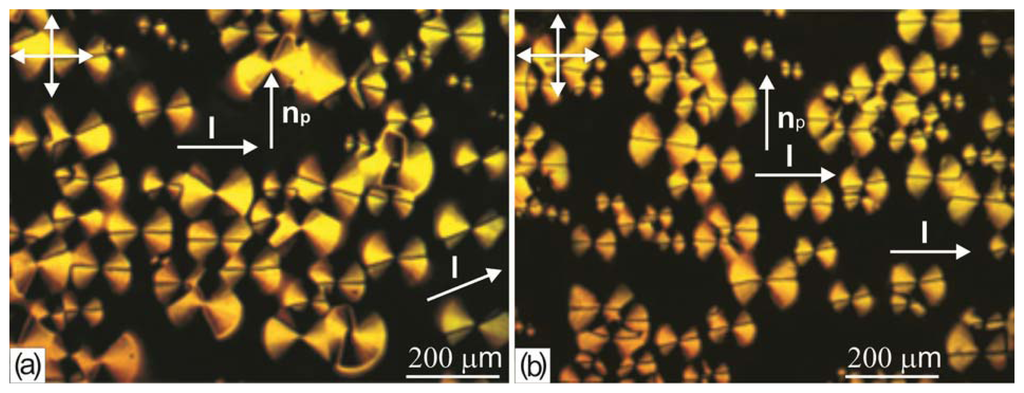 Study of the structural ensembles during the growth in the LC droplets showed that the disclination lines in domains tend to orient perpendicular to the director of the volume nematic layer located above the domains. In the thin LC layer with the schlieren texture, the lines mainly follow the director orientation, while in the thick layer with the thread-like texture they can locally change the nematic alignment near a domain. The effect of the ordering of the disclination lines by the director of the LC layer above the domains was unambiguously revealed in the cells with a cover glass rubbed with silk cloth to form the homogeneous planar orientation of the nematic. In Figure 4a, one can see the trend of the disclination lines to align in the l direction perpendicular to the nematic director np in the cell with the planar layer thickness δ = 10 μm. As the layer thickness is decreased to δ = 6 μm (Figure 4b), the almost complete orientation l ⊥ np is implemented over the entire cell. Microphotographs similar to those shown in Figures 2, 3 and 4 were obtained for MBBA.