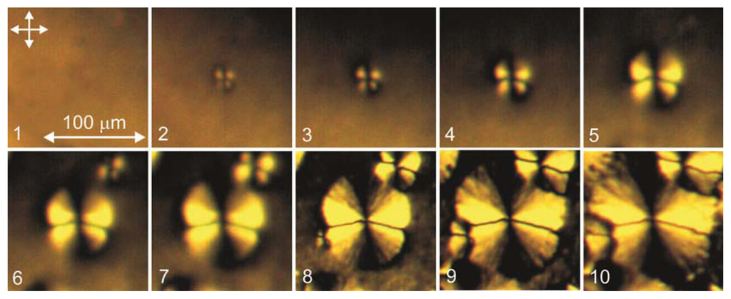 The b-domain growth is illustrated in Figure 5. The domain arises from nucleation seeds and grows to the finite size d ~ 170 μm. During the domain growth, a new nucleus (Frame 6) arises nearby and grows together with the domain. The disclination lines extend with the domain radius. In the case under consideration, they are close to the analyzer direction. In the LC volume, the director makes a certain angle with this direction; therefore, in crossed polarizers the layer looks bright.