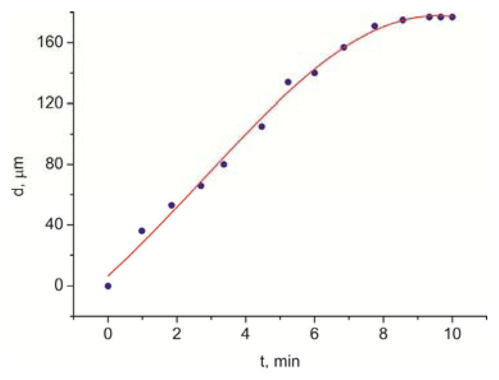 Time dependence of diameter d of a growing 5CB domain deposited on the PC film obtained from the solution in dichloromethane in 1 min (dots). Solid line is the interpolation.