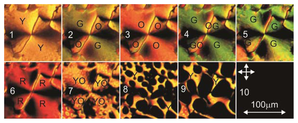 Frames 1–10 reflecting the changes in the MBBA layer texture on the surface of the film obtained from the PC solution in dichloromethane at the temperatures T = 35, 35.4, 35.8, 41, 41.3, 41.6, 42, 43, 45 and 47 °C, respectively. Y, O, G, and R denote yellow, orange, grey, and red colors. Arrows show the light polarization directions.