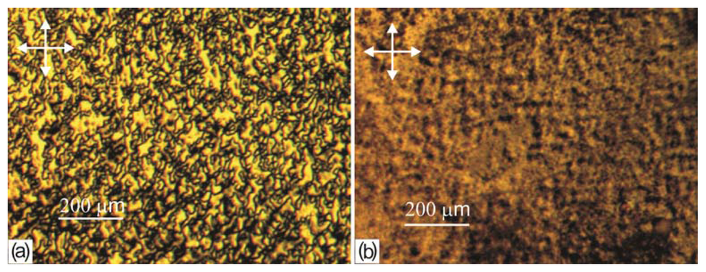 In our experiments, we used granular PC dried at the temperature T = 120 °C during its industrial production. At the LC deposition onto the grain cut, no domain growth was observed, but the schlieren or thread-like LC texture formed and stayed stable for infinitely long time. The PC film obtained from dissolved grains was dried in a thermobalance. During evaporation, solvent weight p vs. time t was continuously determined at different stabilized temperatures. After LC deposition onto the surface of the film dried at T = 120 °C for the time 10 min < t < 15 min, first the thread-like texture occurred and in several hours the textures with entangled thread-likes (Figure 9a) or grain-shaped textures (Figure 9b) formed, depending on the solvent used (dichloromethane or chloroform in the first case and pyridine in the second case). A decrease in the time of the polymer film drying to t < 10 min at T = 120 °C and the temperature reduction to T = 24 °C at all t led to the formation of the domain textures shown in Figure 2a–c.