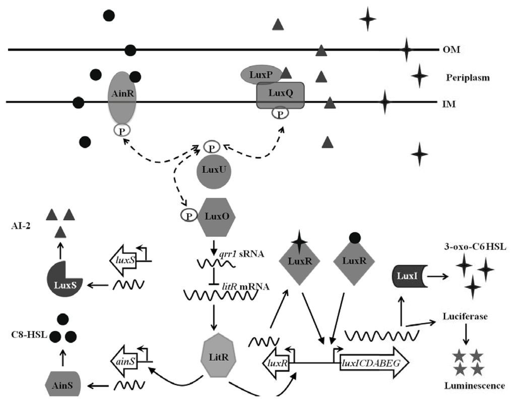 - Callahan, S.M.; Dunlap, P.V. LuxR- and acyl-homoserine-lactone-controlled non-lux genes define a quorum-sensing regulon in Vibrio fischeri. J. Bacteriol 2000, 182, 2811–2822. [Google Scholar]