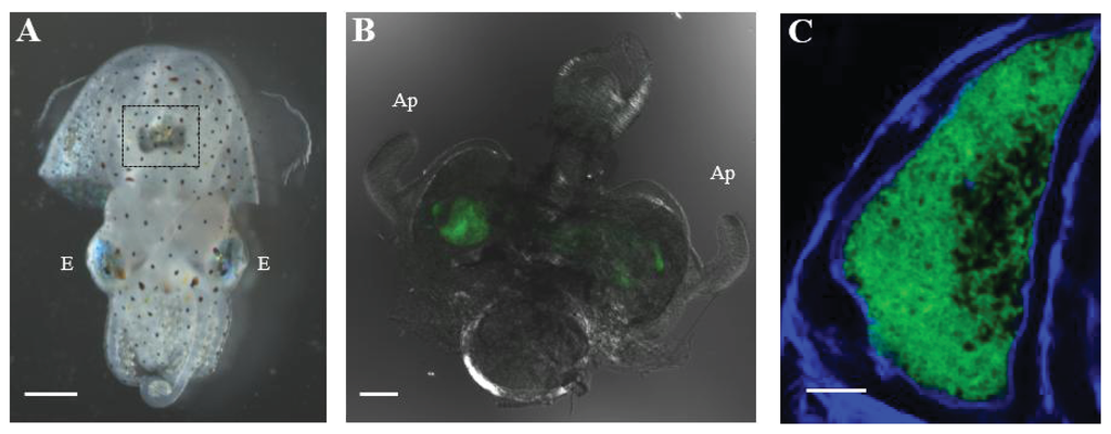 - Sycuro, L.K.; Ruby, E.G.; McFall-Ngai, M. Confocal microscopy of the light organ crypts in juvenile Euprymna scolopes reveals their morphological complexity and dynamic function in symbiosis. J. Morphol 2006, 267, 555–568. [Google Scholar]