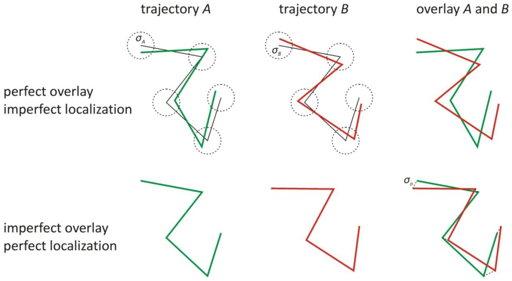 The main input for the scanning window method consists of the trajectory A given by (xA(ti), yA(ti)) and the trajectory B given by (xB(ti), yB(ti)) at the time points ti (with i = 1, 2, ..., l). Another required input is the localization precision σA and σB of trajectory A and B, respectively, calculated within the window as it is scanned along the trajectories, and the overlay precision σo between the images (see Section 5.4 for information on how these values can be determined experimentally).