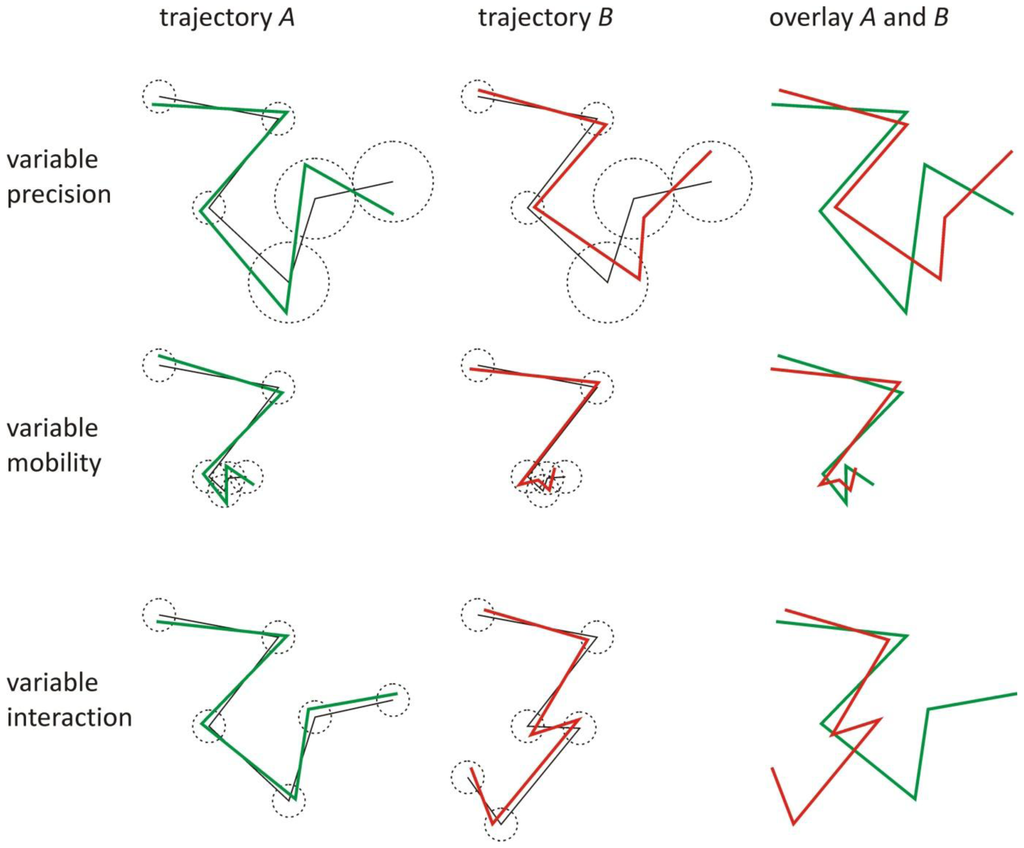 The effect of a time dependent mobility, a time dependent localization precision, or a time dependent interaction on the observed trajectories of interacting objects. The localization precision of the positions in the observed trajectory A (green) and B (red) is defined as the standard deviation (dotted circles) of the observed positions around the positions of the true trajectories (black). When one part of the trajectories exhibits low localization precision, the local relative localization error is large, degrading the correlation in that part. Also, when one part of the trajectories exhibits low mobility, the local relative localization error is large, which in turn degrades the correlation in that part. When the objects do not interact in one part of the trajectories, there is no correlation in that part.