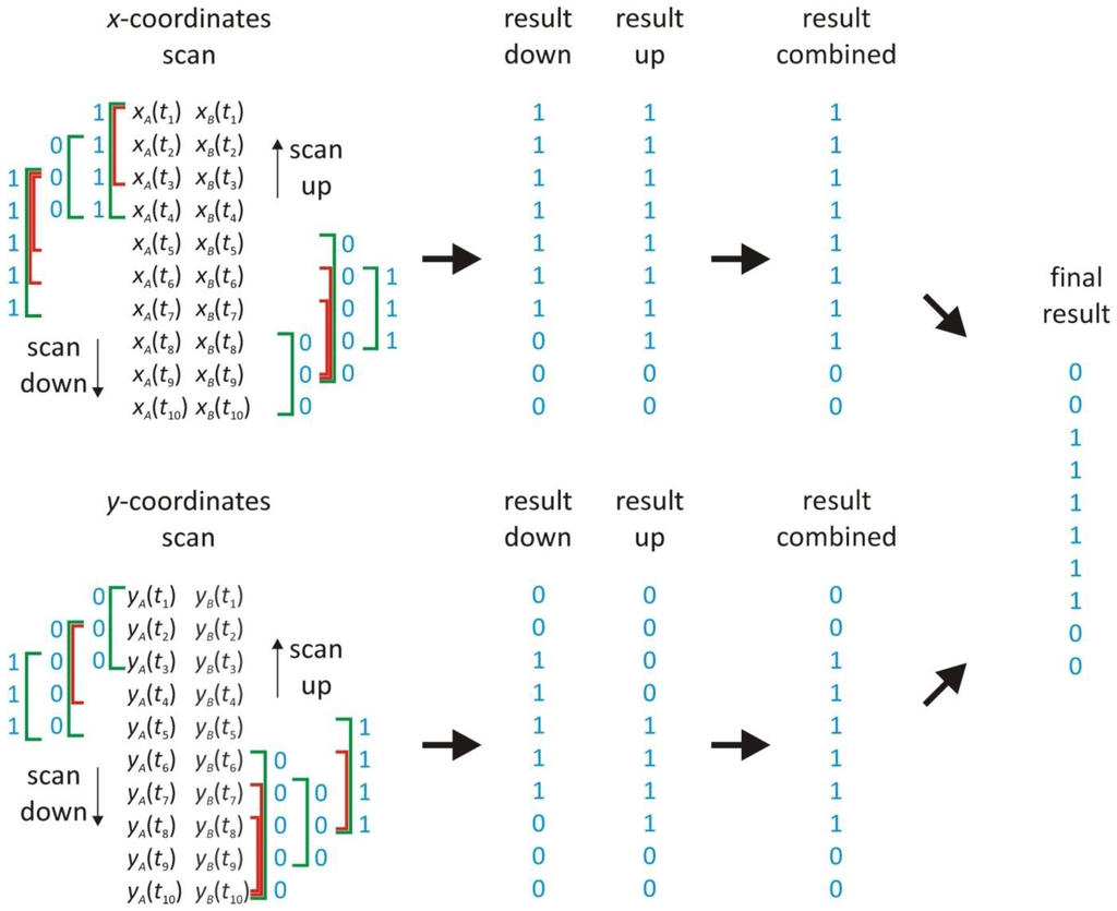 This procedure is repeated, starting at the next positions xA(t2) and xB(t2). The x-coordinates of the trajectories A and B are further scanned, position by position, until xA(tl−2) and xB(tl−2) have been reached. Except near the start and the end of the trajectory, the positions are evaluated at least three times by different windows. Therefore, for each position there are at least three binary values, indicating that correlation was found or not within a particular window. If correlation was found at least one time, the position is flagged as being correlated. This results in a list of binary values that identify the positions where the scan found correlation (see Figure 3). The same scanning procedure is repeated in the other direction, starting from xA(tl) and xB(tl) and moving towards the start of the trajectory. The results from both scanning directions are combined so that a position is correlated if it was flagged in one of both scanning directions (see Figure 3).