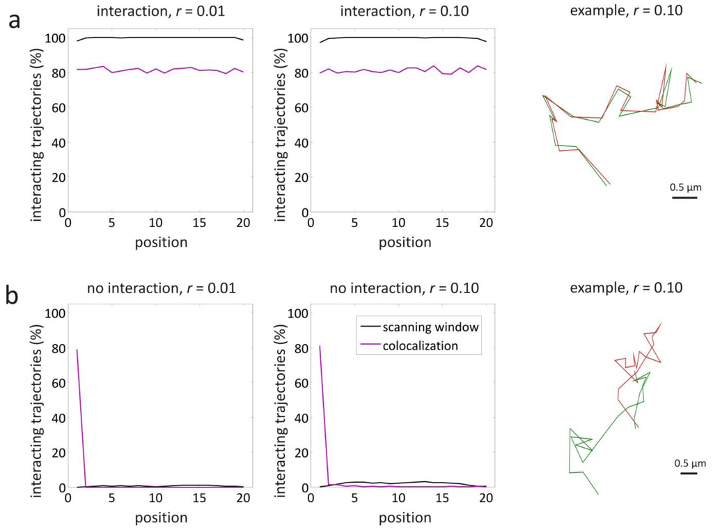 The situation of complete interaction was investigated for a diffusion coefficient D = 1 μm2/s. The results are shown in Figure 4a, where for each position along the trajectories the percentage of trajectories where the scanning window method has detected interaction is shown. In case of high localization precision σ = 4.47 nm, corresponding to a relative localization error of r = 0.01 (cfr. Equation (2) with