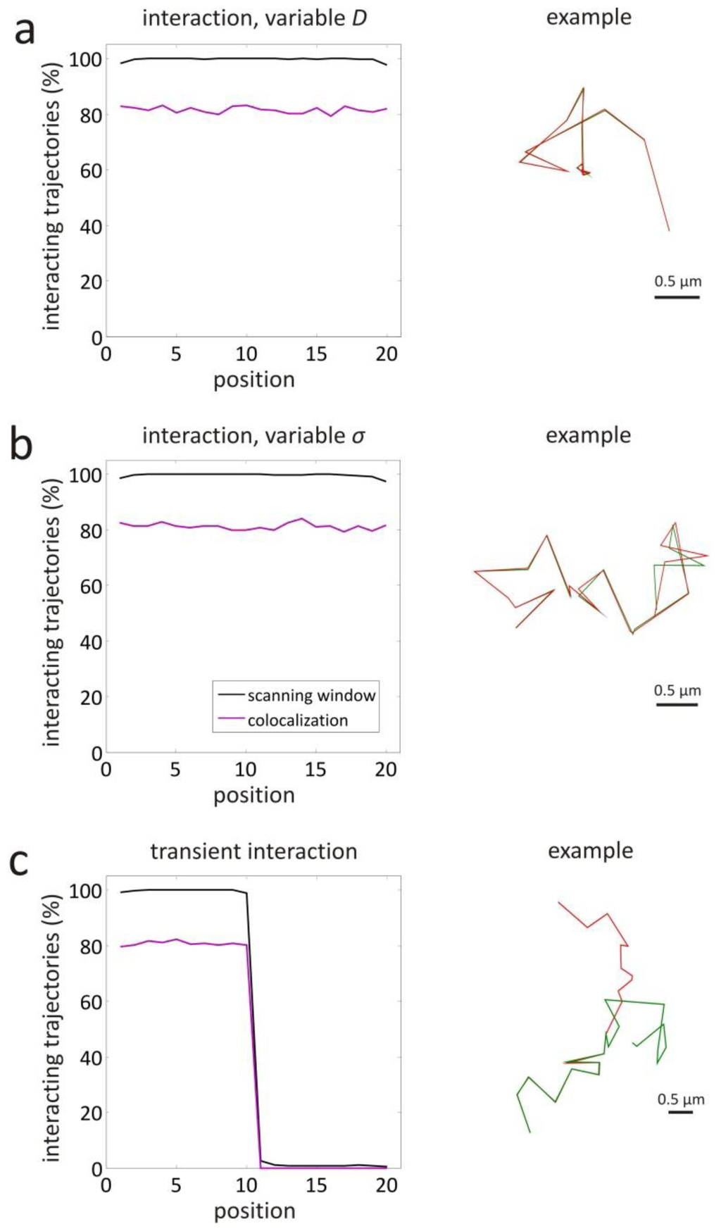 Simulations were also carried out to evaluate the performance of the scanning window method in more complicated situations (representing the ones shown in Figure 2). The case of complete interaction with a variable diffusion coefficient was investigated for D = 1 μm2/s at positions 1–10 and D = 0.01 μm2/s at positions 11–20. This results in a corresponding local relative localization error r = 0.01 and r = 0.10, respectively, since the localization precision σ = 4.47 nm was constant at all positions. Thanks to the variable window size, the scanning window method finds interaction 100% of the time at most positions, as shown in Figure 5a. Only at the trajectory extremities, the method performs slightly worse, with interaction correctly detected 98% of the time. Although the object based colocalization method with maximum distance