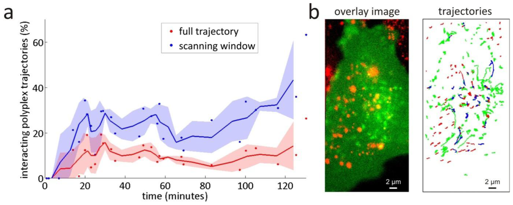 The scanning window method is, therefore, expected to perform better in the investigation of intracellular trafficking of nanomedicines than the full trajectory method, since it inherently is capable of detecting interaction in small segments of trajectories. First, as a negative control, dual colour SPT measurements of a mixture of non-interacting yellow-green and dark red fluorescently labelled 0.1 μm diameter beads undergoing free diffusion were analysed with the scanning window method to verify that no interactions are detected (see Appendix). Next, as a proof of concept, the scanning window method was applied to the dual colour SPT data of the postendocytic trafficking of polyplexes inside living cells (more details on the experiments can be found in Sections 5.2–5.4). The measured percentages of polyplex trajectories that are interacting in at least one window with a flotillin-2 endosome trajectory are shown in Figure 6a, together with the results obtained with the full trajectory method []. The data points show the percentages for individual dual colour SPT movies that each correspond to a different cell. Because of the variability between living cells, there is a strong variability in the corresponding percentages. The running average over three subsequent values is plotted to better indicate the observed trend. Comparison between the values from both methods shows that the scanning window method found at least two times more interaction than the full trajectory method. The same qualitative trend is found as for the scanning window method, indicating that the underestimation of the full trajectory method is systematic, and should thus always be accounted for.