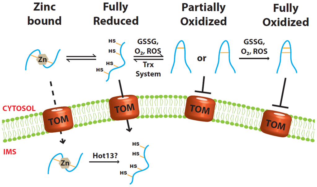 Only the Cys-reduced small Tim precursor proteins are import-competent. The small Tim proteins have to be kept in their reduced conformation while in the cytosol. Neither the fully nor the partially oxidized proteins can be imported into mitochondria. Oxidation could be brought about by GSSG, oxygen or reactive oxygen species (ROS). Partially oxidized proteins can be reduced by the cytosolic Thioredoxin system. Additionally, the reduced proteins could be stabilized by zinc binding, although it is uncertain whether the zinc-bound form can be imported directly.