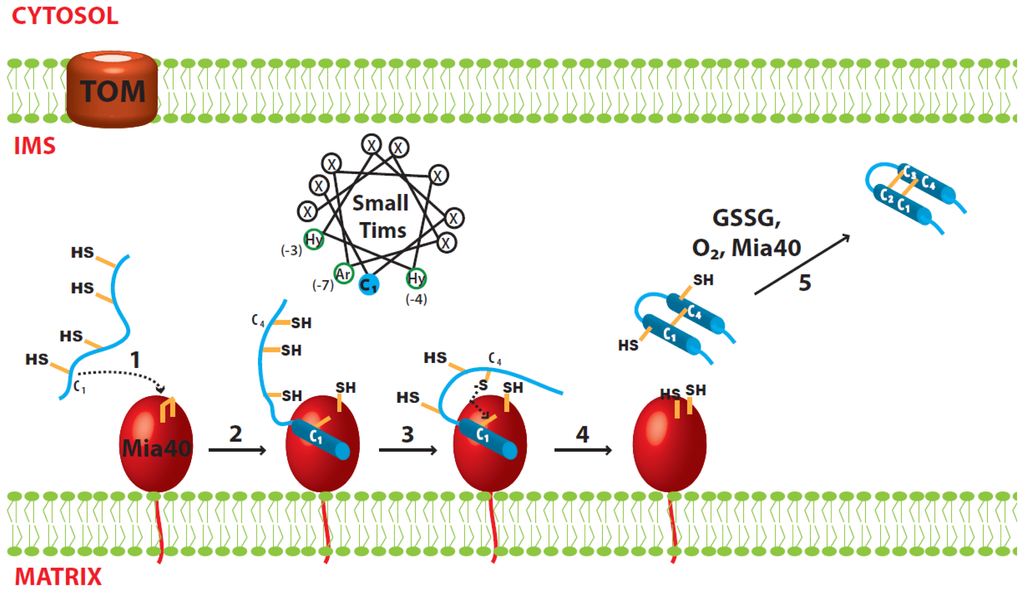 All mitochondrial IMS proteins are synthesized in the cytosol and have to be imported into mitochondria for their function. A unique feature for most of the IMS proteins is that their post-translational import is regulated by their cysteine redox state [11,12]. The biogenesis of the small Tim proteins is tightly coupled with their oxidative protein folding, which can be divided into four sequential steps: (i) In the cytosol the precursor proteins are kept in a reduced and unfolded form by cytosolic factors [13,14]; (ii) mitochondrial import of the reduced precursor proteins through the TOM complex [15]; (iii) oxidative protein folding in the IMS regulated by the mitochondrial import and assembly (MIA) pathway [16–18]; (iv) assembly of the oxidized, partially folded proteins into hexameric small Tim complexes [19,20]. All of these steps depend on the redox state of the conserved cysteine residues—while only reduced unfolded proteins can be imported into mitochondria, protein folding and complex formation requires disulfide bond formation. Here, we review the current knowledge regarding each step of the biogenesis and folding of the mitochondrial small Tim proteins with focus on Tim9 and Tim10. We will also discuss how the small Tim hexameric complex is assembled, and the mechanism by which this complex might perform its chaperone function.