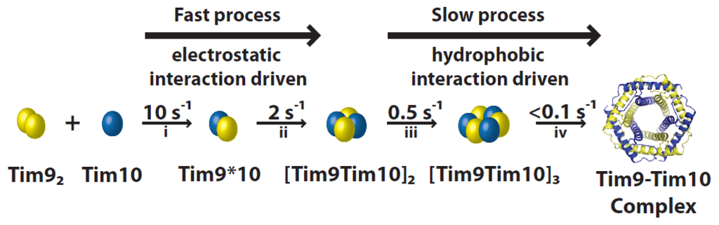 Tim9–Tim10 hexameric complex assembly. The process can be separated into four kinetic steps: formation of a heterodimer (i), a tetramer (ii), a hexamer (iii) and a final hydrophobic rearrangement (iv). The two initial fast steps are controlled mainly by electrostatic interactions, whereas the final two slow steps are driven by hydrophobic interactions.