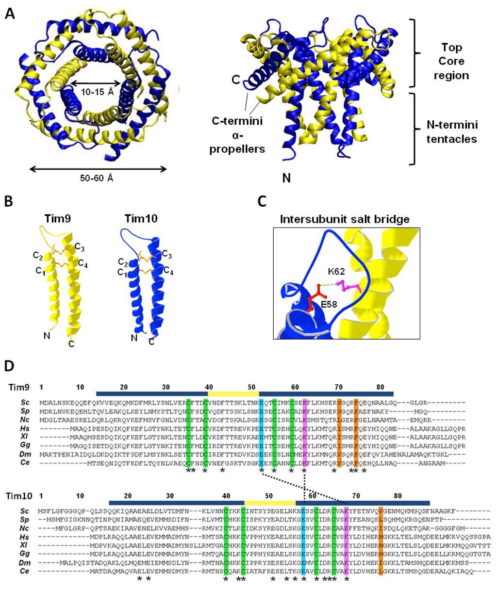 Tim9–Tim10 hexameric complex. (A) Crystal structure of yeast Tim9–Tim10 complex, top (left) and side (right) view respectively (PDB: 3DXR). Tim9 (yellow) and Tim10 (blue). The outer layer is formed by the six C-terminal helices (α-propellers) and the inner layer by the six N-terminal helices (tentacles); (B) Structure of Tim9 and Tim10 showing the two helices linked by intramolecular disulfide bonds (orange) (PDB: 3DXR); (C) Conserved salt bridge between a glutamate residue in the loop of Tim10 and a lysine residue in the outer helix of Tim9; (D) Alignment of Tim9 and Tim10 amino acid sequences. Fully conserved residues are marked with asterisks (*). Helical regions and the central loop are marked in blue and yellow respectively. Conserved cysteine residues are highlighted in green. Key charged residues are highlighted in pink (positively charged) and light blue (negatively charged), and salt bridges between them are marked with a dotted line. Central residues of hydrophobic clusters are highlighted in orange. Sc: Saccharomyces cerevisiae, Sp: Schizosaccharomyces pombe, Nc: Neurospora crassa, Hs: Homo sapiens, Xl: Xenopus laevis, Gg: Gallus gallus, Dm: Drosophila melanogaster, Ce: Caenorhabditis elegans.