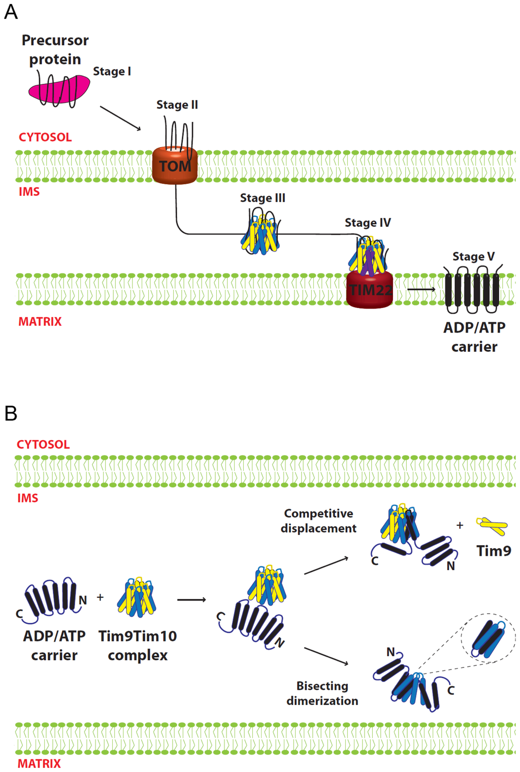 Small Tim function in carrier protein biogenesis. (A) Biogenesis of AAC. Stage I, precursor in the cytosol is bound by chaperones. Stage II, precursor engages the TOM complex at the mitochondrial OM. Stage III, precursor is bound by the small Tim proteins and chaperoned through the IMS. Stage IV, precursor interacts with Tim12 (in purple) and reaches the TIM22 complex. Stage V, the carrier protein is fully inserted in the IM and dimerizes into its functional form; (B) Model for small Tim proteins interaction with the AAC substrate. AAC binding is initiated through the N-termini of the small Tim subunits. AAC could either substitute a Tim9 subunit (competitive displacement) or cut across some of the complex subunits (bisecting dimerization). The two models are not mutually exclusive and at least one Tim9 subunit remains in close proximity to the substrate.