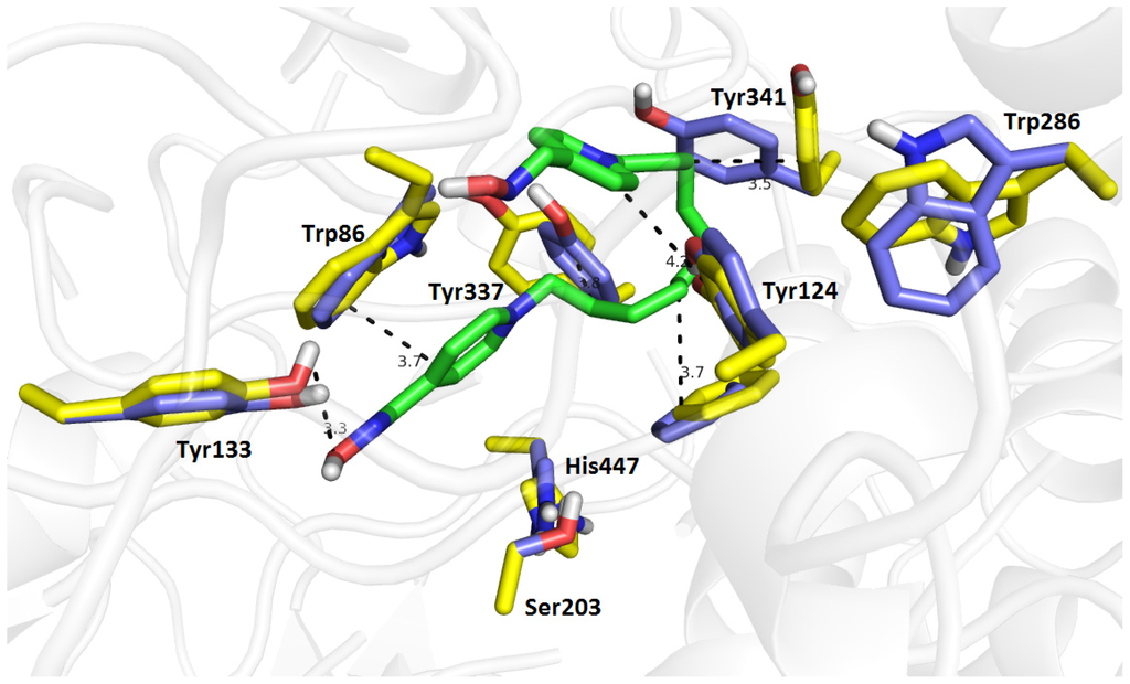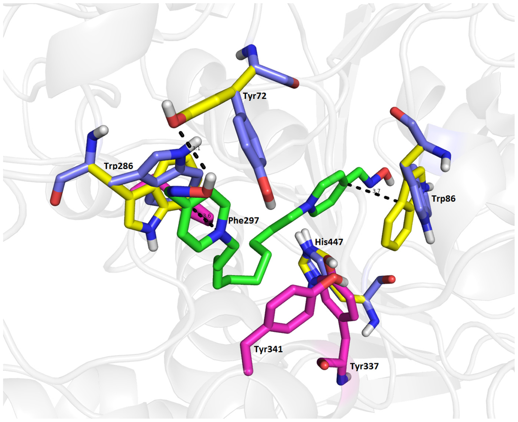 The results for the hrAChE docking calculation are shown in Figure 10. The original crystal structure positions of important amino acid residues are displayed in blue, those that were computationally reoriented in yellow, and residues having direct interactions with 13 are shown in magenta (Figure 10). The top-scored docking pose for 13/hrAChE complex (−8.7 kcal/mol) shows important π-π and cation-π interactions (Figure 10). The peripheral pyridinium moiety is oriented ring-to-ring facing Trp286 (3.6 Å). For this interaction to occur, the indole skeleton of Trp286 (yellow) undergoes a ~63° rotation relative to its conformation in the original position in the hrAChE crystal structure (blue Trp286). Tyr72 is also dramatically reoriented (~59°) to provide hydrogen bonding with the oxime group of the distal pyridinium moiety with a distance of 3.1 Å. Interestingly, Tyr72 is excluded from parallel π-π bonding and gives only a weak π-π, T-shaped interaction (4.2 Å). The largest structural alterations, upon the binding of 13 to hrAChE, are observed for Trp86 in the cation-π site that bind to the distal pyridinium ring (3.7 Å). The atoms of this residue show a ~60° rotation from their original position in the hrAChE crystal structure. The catalytic triad is only slightly affected by 13, a very frail π-π interaction is observed between the distal pyridinium ring and His447 (4.5 Å), which is slightly rotated. The side chain of Glu202 is close to the oxime group (3.7 Å) forming a hydrogen donating bond. In the gorge between both pyridinium units, the 10-carbon spacer spans the length of the active site gorge and is consistent with the idea of a dual binding site interaction as mentioned above. In the middle of the gorge, the aliphatic chain of 13 was surrounded by the phenyl rings of Phe297 (3.4 Å), Tyr337 (4.3 Å) and Tyr341 (3.4 Å) stabilizing 13/hrAChE. The distance between both moieties is approximately 20 Å which is in accordance with the distance between peripheral anionic site and catalytic site of hrAChE [22].