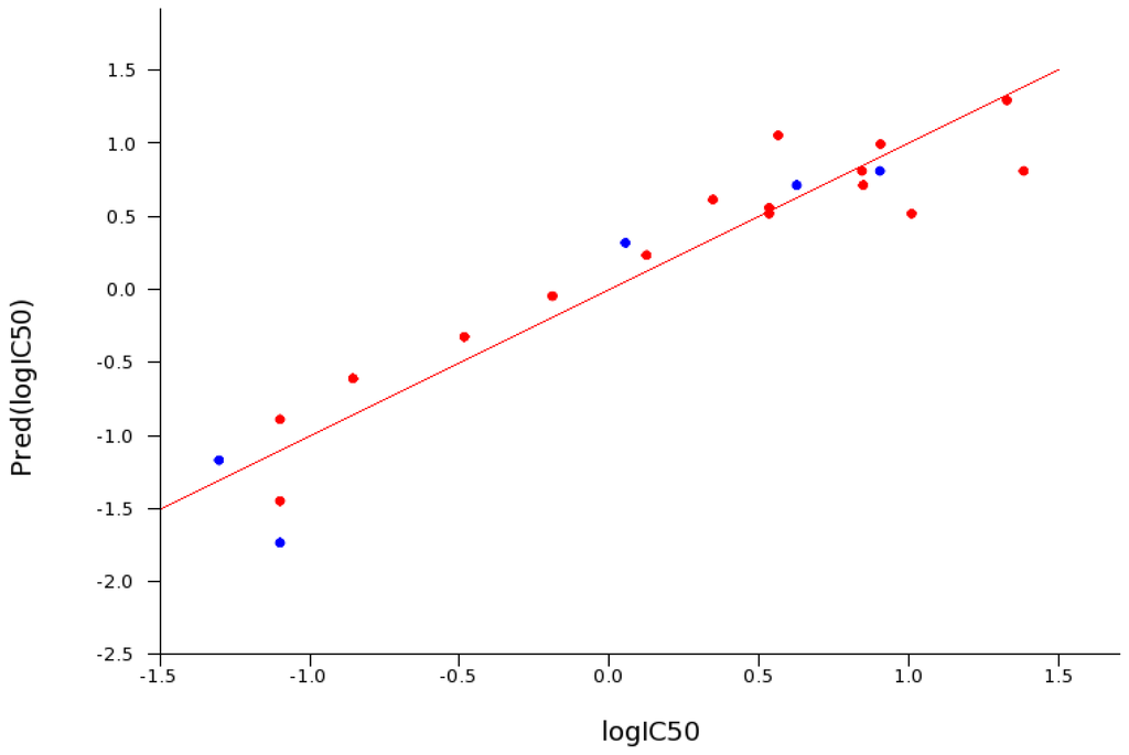 Experimental versus predicted pIC50 values for the 21 compounds in this study. The IC50 prediction was based on the eight descriptors identified by principle component analysis. The “leave one out”—Q2, correlation was 0.86. Red dots are compounds used in the training set and blue are from the test set. In general, extension of the linker length increased the inhibition potency of the bis-pyridinium oximes. Compounds 4, 6, 24 are currently approved as organophosphorus poisoning (OP) antidotes in various parts of the world.