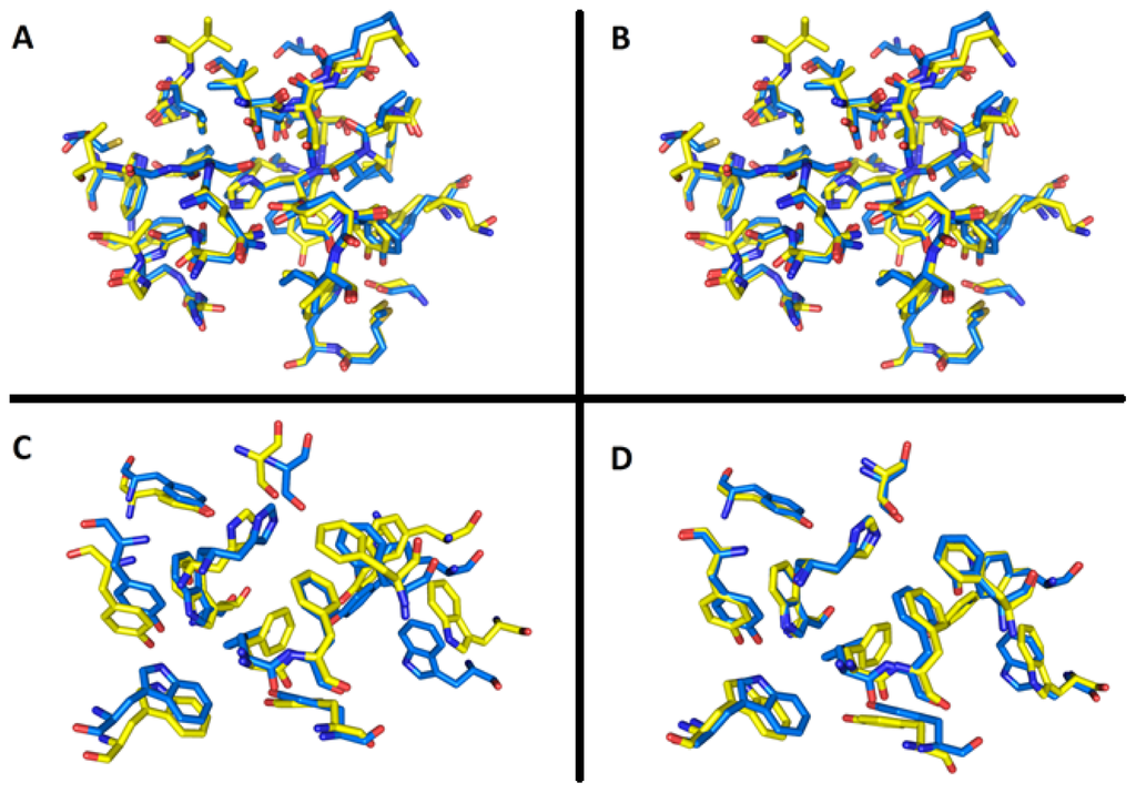 Superimposition of TcAChE active site (yellow) on EeAChE active site (blue) residues within R = 8 Å spherical selection calculated by super (A) root-mean square deviations (RMSD) (super) = 0.400 Å and align (B) RMSD (align) = 0.416 Å algorithm. Alignment of 13 flexible residues is rendered in the same manner (C) RMSD (super) = 0.586 Å; (D) RMSD (align) = 0.536 Å.