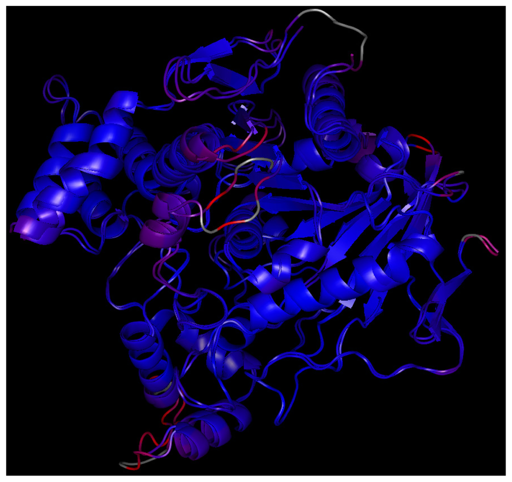 Overall superimposition of TcAChE on EeAChE colored by Cα RMSD (“super” algorithm used, 449 Cα carbon atoms matched). Dark blue is a good alignment; higher deviations are in orange/yellow/red. Residues omitted in the alignment are white. Minimum Cα distance: 0.04 Å, maximum Cα distance: 5.25 Å, average Cα distance: 0.71 Å, Cα RMSD = 0.545 Å.