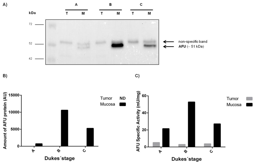 Expression and activity of AFU in colorectal cancer patients in different Dukes’ stages (stages A, B and C); (A) Immunodetection of AFU by Western blot in tumor (T) and healthy mucosa (M); each lane was loaded with 60 μg protein. The upper band is a non-specific band cross-reacting with the secondary antibody; (B) Quantification of AFU protein band in the same samples; this band was not detectable in tumor samples; (C) AFU specific activity in the same paired tumor and mucosa samples. (AFU: alpha-l-fucosidase, AU: Arbitrary Units, ND: Not Detectable).