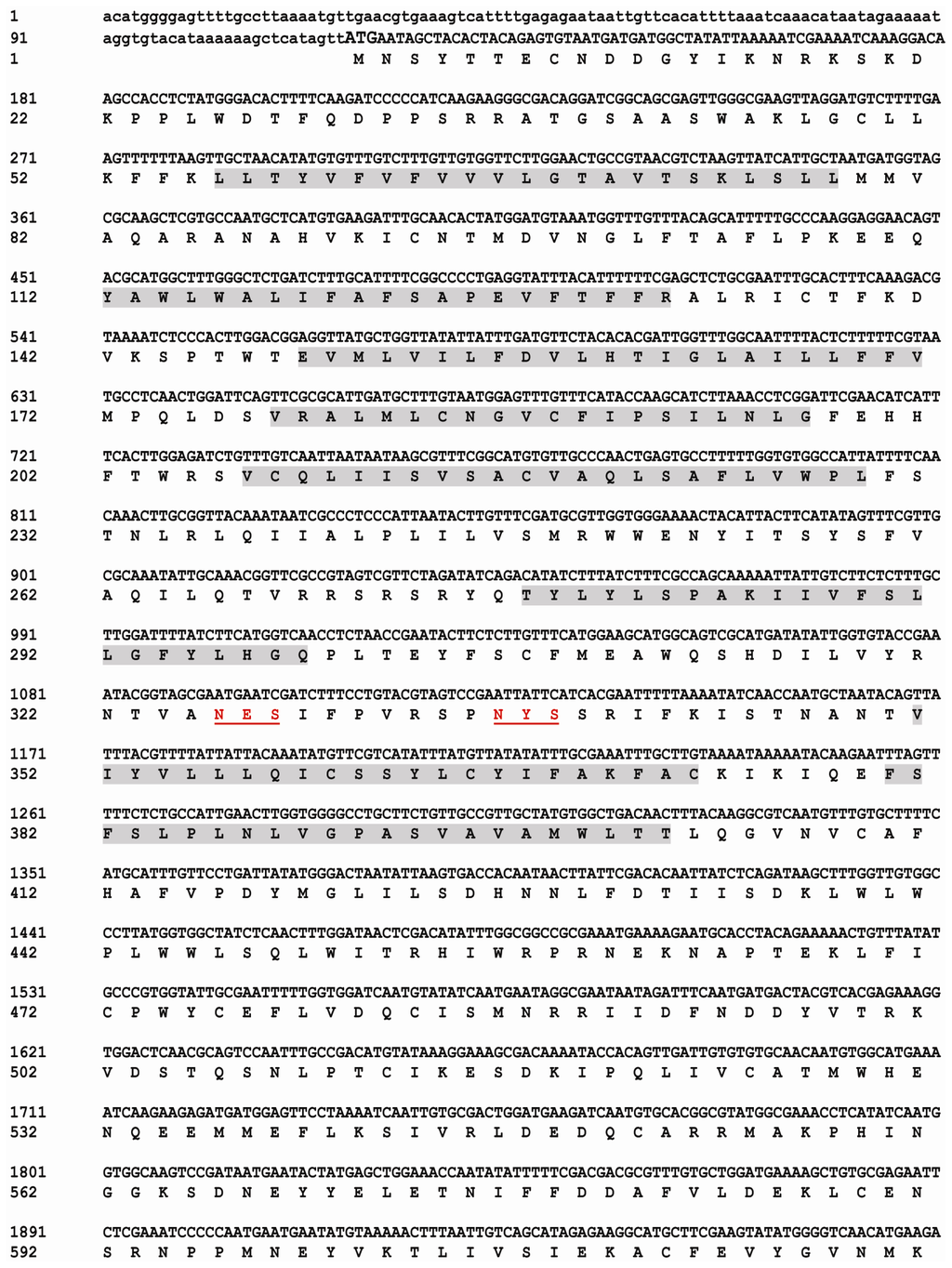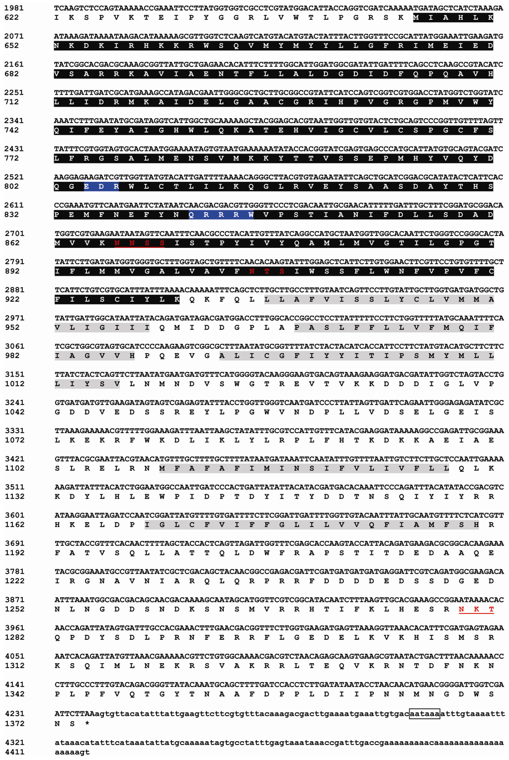 Nucleotide and deduced amino acid sequences of BdCHS2 cDNA from Bactrocera dorsalis (KC354694). The start codon is indicated in bold and the stop codon in bold with an asterisk. The putative polyadenylation signal (AATAA) is boxed. The putative transmembrane regions are shaded. The five potential N-glycosylation sites are double underlined. The amino acid sequence of the putative catalytic domain is in gray with black background. The signature sequences (EDR and QRRRW) are in white with a wavy line.
