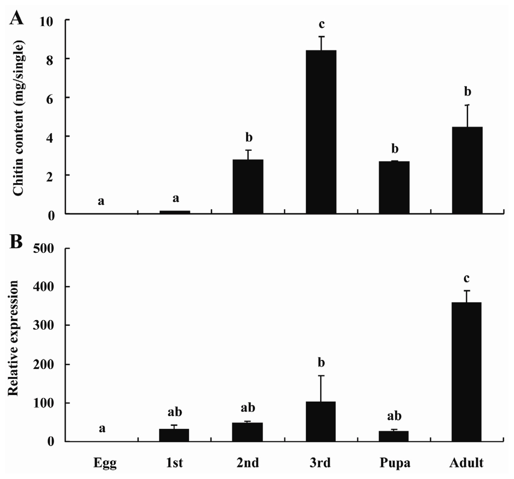 Eggs, the first, second, and third instar larvae, pupae, and adults were used for total RNA isolation using RNeasy® Plus Micro Kit (with gDNA Elimator spin columns, Qiagen, Valencia, CA, USA) (e.g., egg, the first instar larvae) or TRIzol reagent and treated with DNase (TaKaRa) for DNA digestion (e.g., the second, and third instar larvae, pupae, and adults). The stage-specific expression was examined using qPCR as pre-mentioned method. Furthermore, the chitin content in different developmental stages was assayed based on the previous described method [43–45]. Briefly, the sample (30 individuals for each sample) was homogenized with 1.0 mL of distilled water by grinding in a cold mortar. Then, the chitin was isolated from the sample after treated by centrifuged and 3% SDS (sodium dodecyl sulfate). To deacetylate chitin, it was re-suspended in 0.3 mL of 14 M KOH and incubated in drying oven at 130 °C for 1 h. The insoluble chitosan was obtained after purified by different concentrations of alcohol. 100 μL of the chitosan solution was mixed with 100 μL of 10% NaNO2 and 100 μL of 10% KHSO4 to depolymerize the chitosan and deaminate the glucosamine residues from the chitosan. After treated by 12.5% NH4SO3NH2 (Sigma-Aldrich, St. Louis, MO, USA), the sample was added to MBTH (3-methyl-2-benzothiazolone hydrazone hydrochloride hydrate, Sigma-Aldrich) (50 mg/10 mL) and 0.83% FeCl3. Finally, 100 μL of each sample was transferred to a 96-well microplate and then colorimetric assay under 650 nm in a microplate reader (Sigma Laborzentrifugen GmbH, Ostrode, Germany). According to a standard curve constructed by using known concentrations of glucosamine (Sigma-Aldrich), chitin content was calculated as a glucosamine equivalent. Three biological replications, each with two technical replications, were used in this analysis.