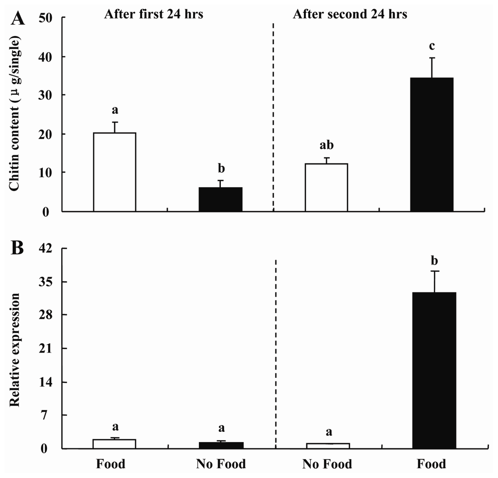 The 1-day-old third instar larvae were used for this experiment. Eight Petri dishes (diameter = 4 cm) were divided into two groups, each with four Petri dishes. The insects in the first group were maintained with the artificial diet (designated as with food) for 24 h and then with no food for next 24 h, while the insects in the second group were maintained with no food for 24 h and then with food for the next 24 h. Total RNA was isolated from the dissected midguts of the two groups after 24 and 48 h treatment. The transcript levels were measured using qPCR as mentioned above. Furthermore, the chitin content in the midguts of the above treated larvae was assayed.
