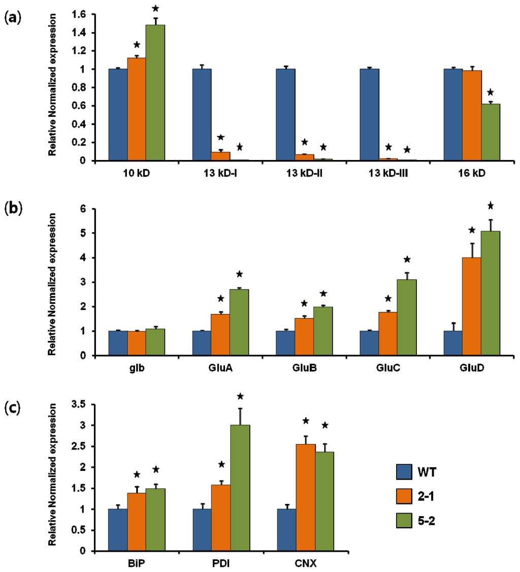For the other PB-II storage protein genes, glutelin gene expression was significantly up-regulated, but α-globulin expression was not changed in the 13 kD pro-RNAi lines. To investigate how transcript levels of glutelin subfamilies were reflected in the increased glutelin expression, we performed qRT-PCR using glutelin subfamily-specific primers designed to independently detect the transcript levels of gluA, gluB, gluC, and gluD (Table S1). The level of gluD was markedly increased in the 13 kD pro-RNAi lines, whereas the levels of GluA, GluB, and GluC were slightly increased (Figure 1b). Prolamin knockdown rice has been reported in several studies. For example, in 13 kD Pro-less transgenic rice seeds the targeted prolamin gene expression levels were effectively down-regulated, whereas the expression levels of α-globulin and glutelins of PB-II were up-regulated [17]. In contrast, we detected no change in the level of α-globulin in the present results (Figure 1b).