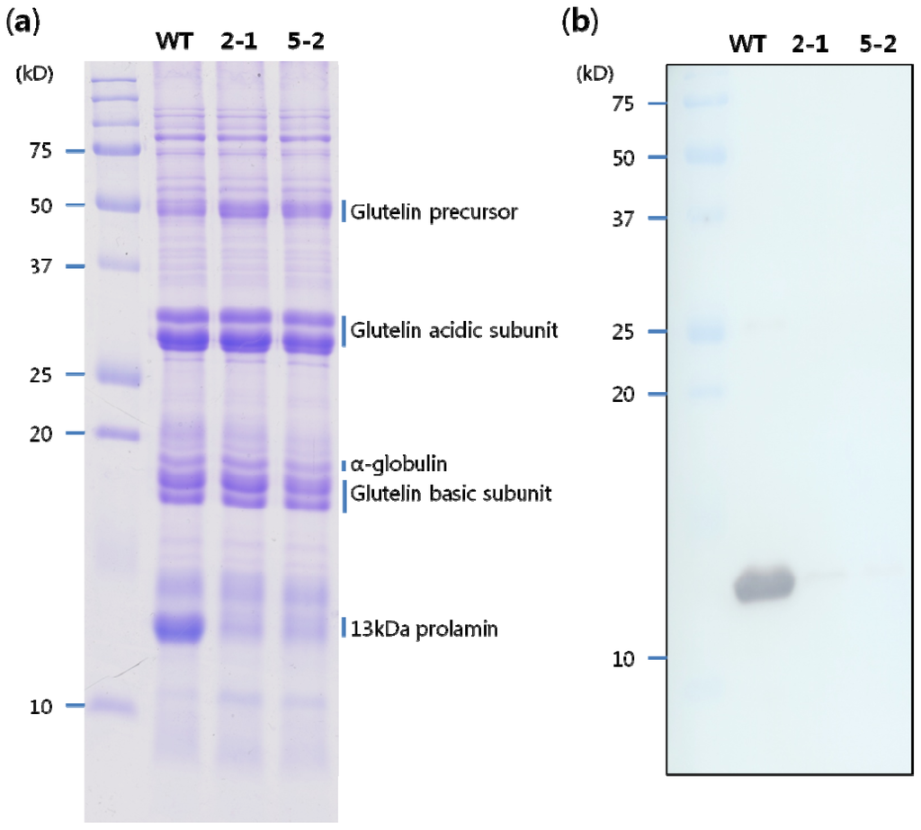 The rice seed storage proteins consist of 57 kDa glutelin precursors, 40 kDa acidic and 20 kDa basic glutelin subunits, a 26 kDa α-globulin polypeptide; and 16, 13, and 10 kDa prolamin polypeptides [13]. To analyze changes in storage proteins in the 13 kD pro-RNAi lines the total seed protein was extracted from T1 mature seeds and separated by SDS-PAGE. The level of accumulation of 13 kD prolamin in two 13 kD pro-RNAi lines showed significant reduction. However, the level of the glutelin precursor was slightly increased, whereas levels of the remaining storage proteins were not changed in any transgenic line relative to the WT (Figure 2a).